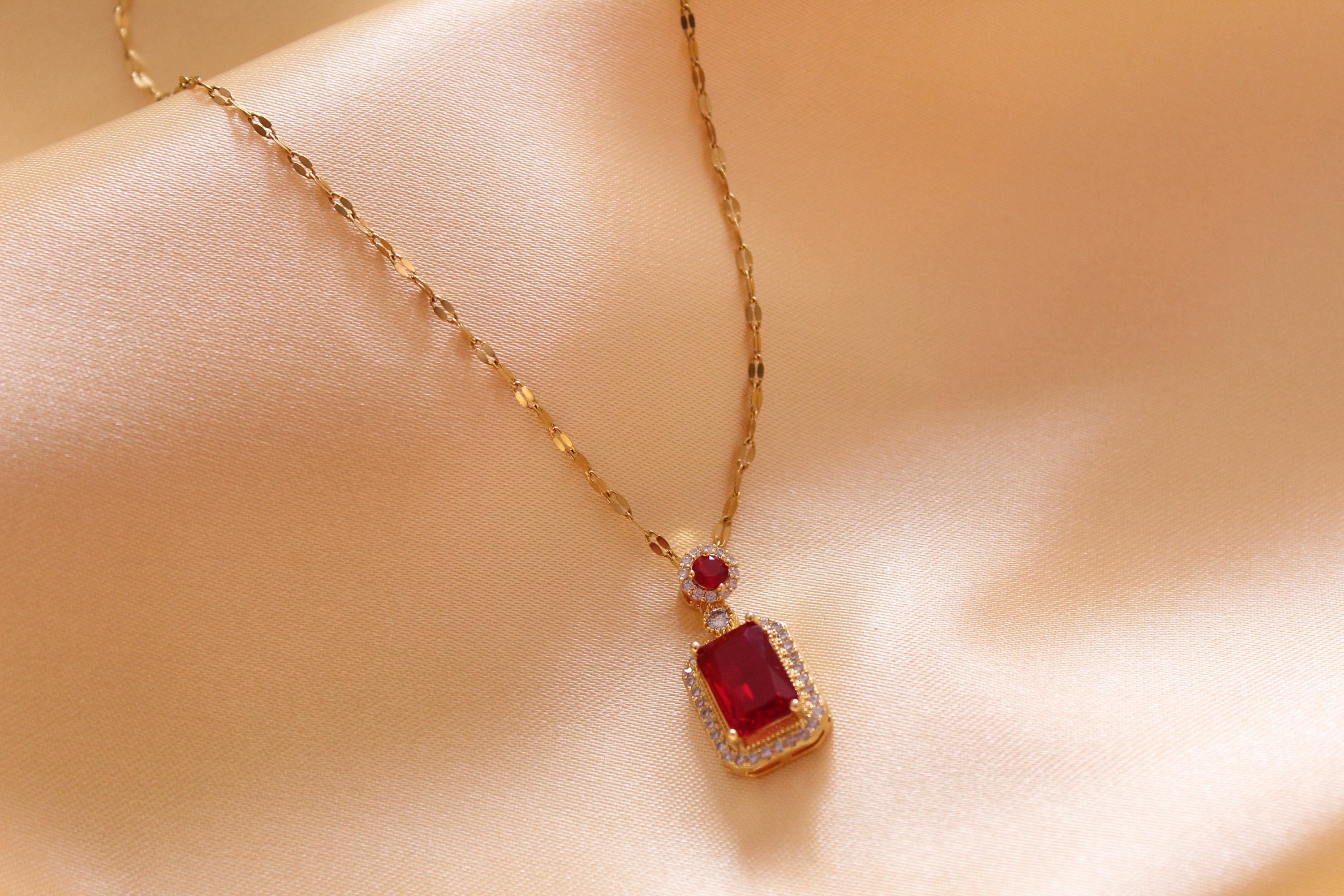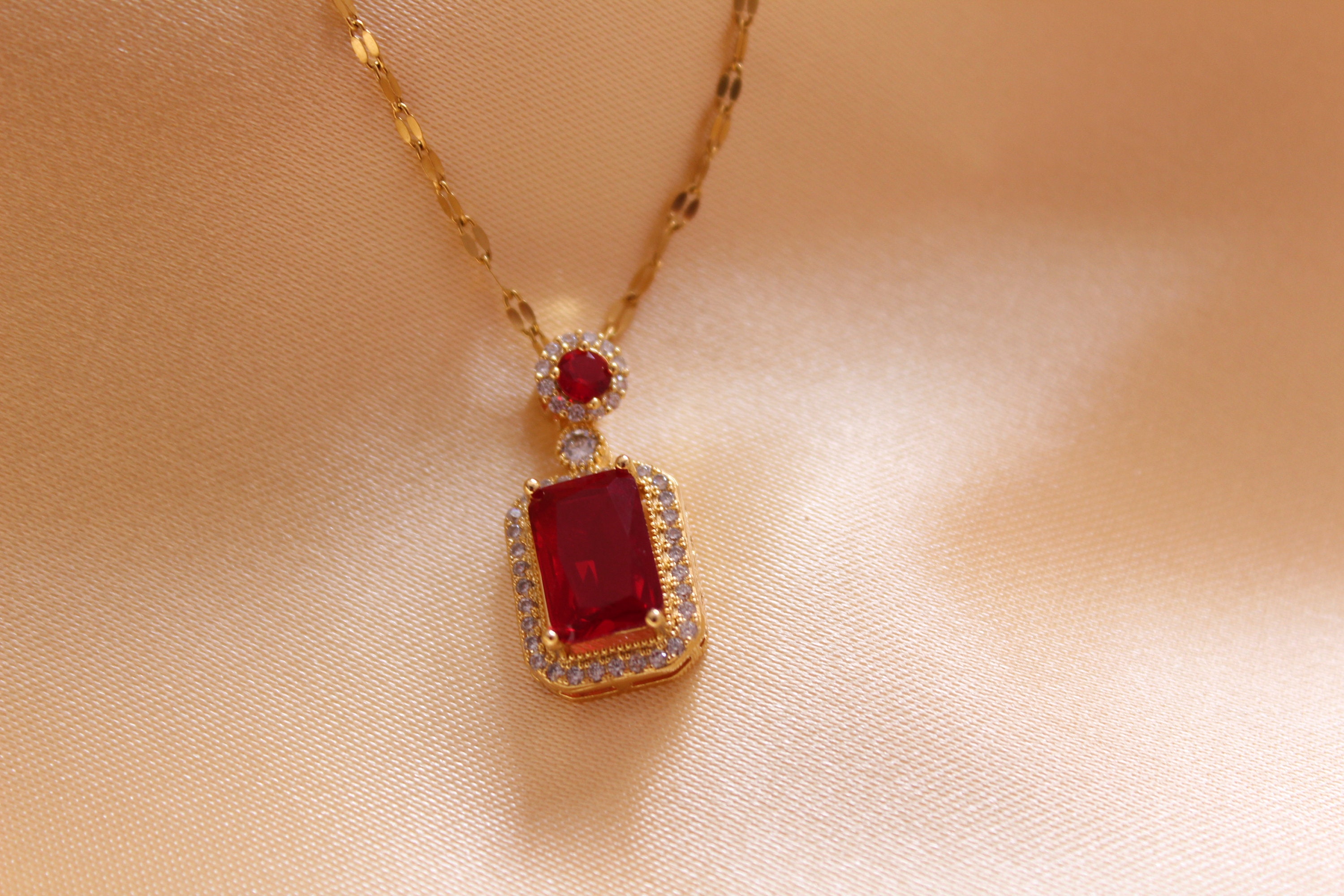 Only the finest materials are used in creating this necklace, from the dazzling red zircon to the metal setting and chain.