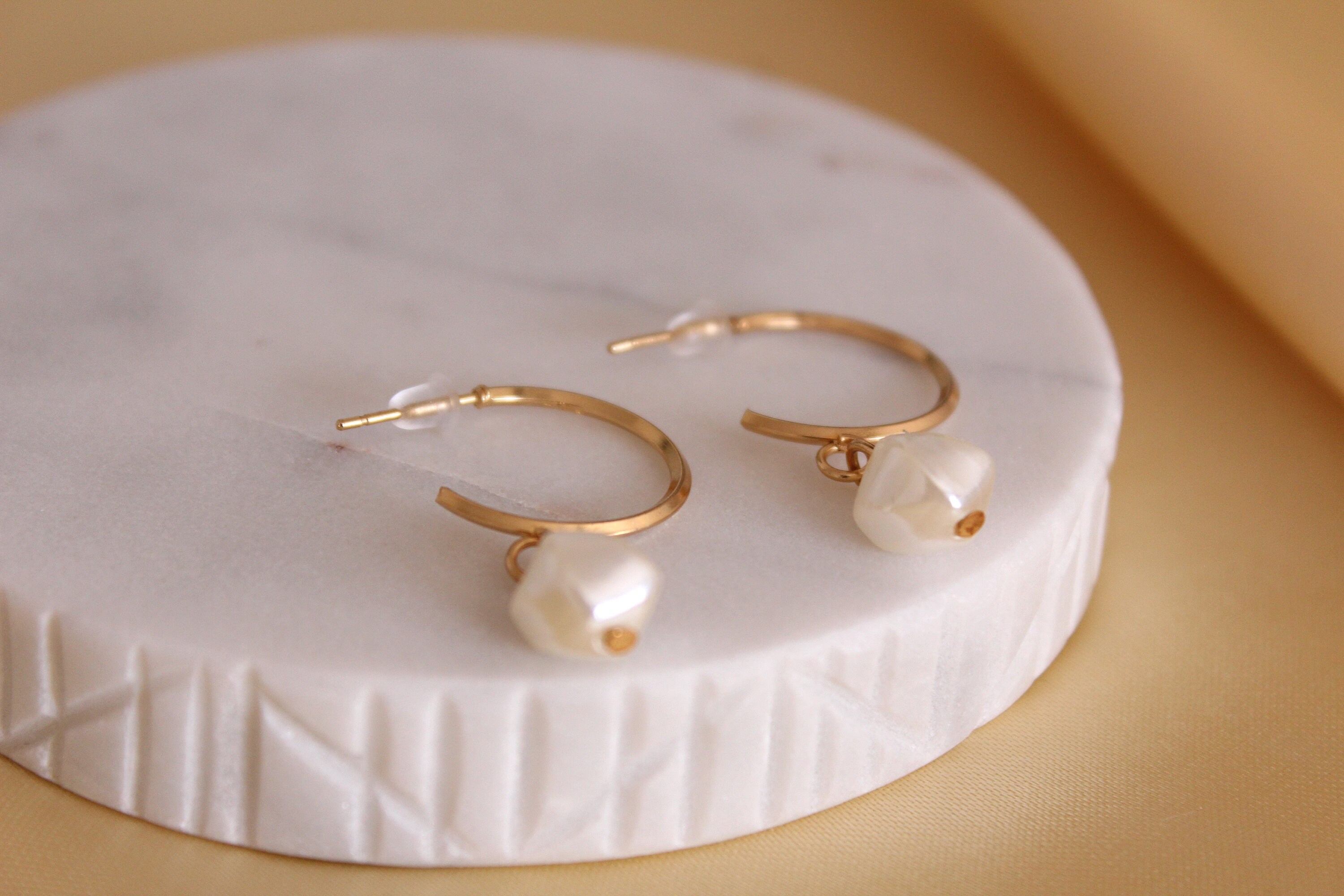 Pearl Perfection: Adorning the geometric metal elements are lustrous pearls that exude timeless charm and sophistication. The combination of pearls with the sleek metal creates a captivating contrast, making these earrings ideal for both casual and formal occasions.