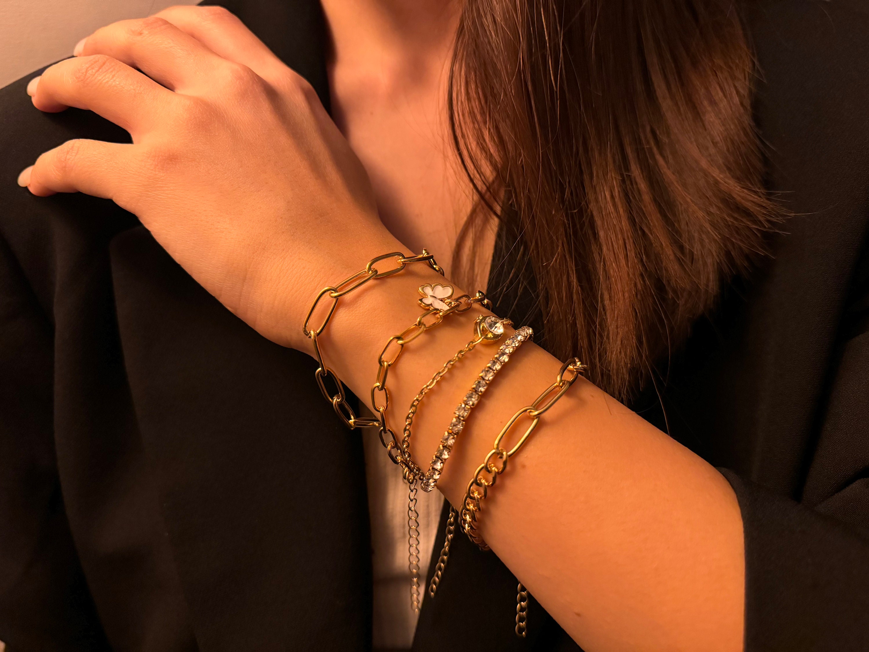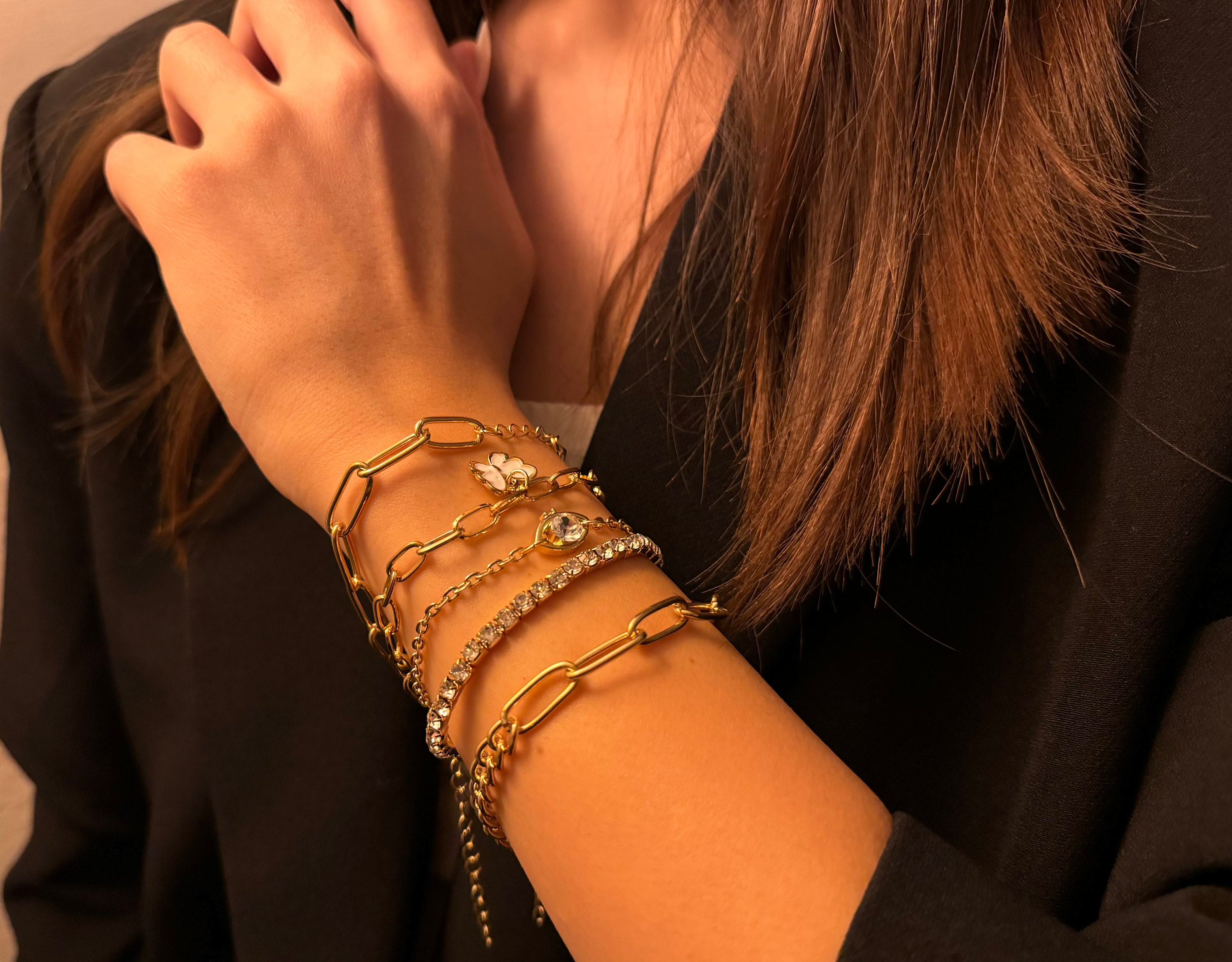 Introducing our exquisite Gold Bracelet Set, a versatile and elegant collection of five stunning bracelets designed to enhance her style and serve as a thoughtful gift. This set includes a Diamond Bracelet, Clip Bracelet, and a unique White Butterfly Bracelet, all crafted from high-quality stainless steel, making it a perfect addition to her jewelry collection.