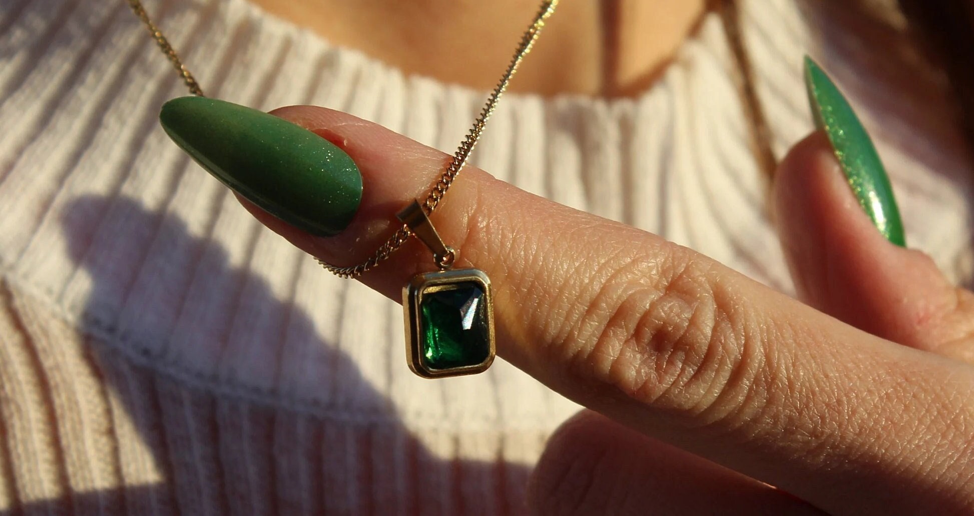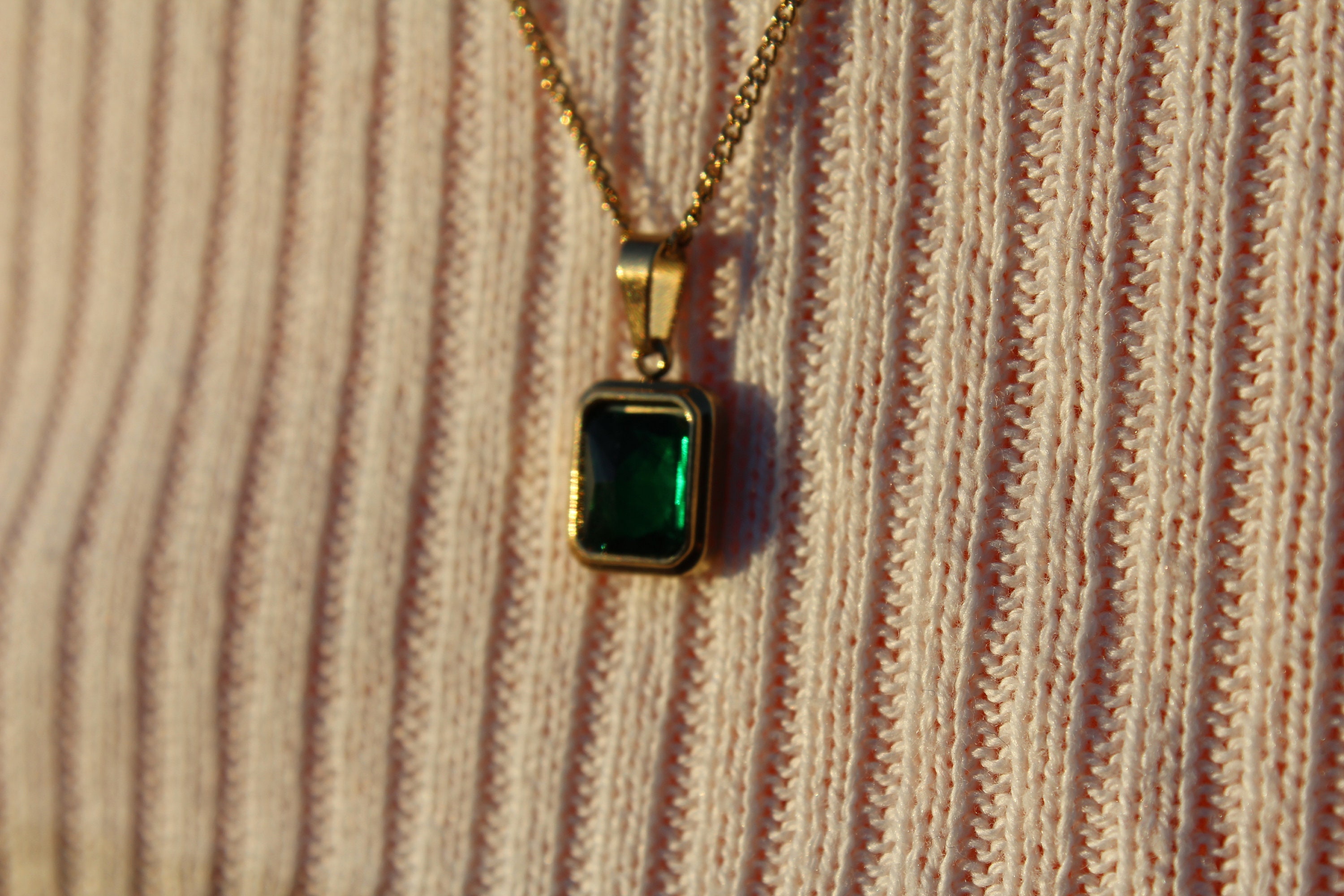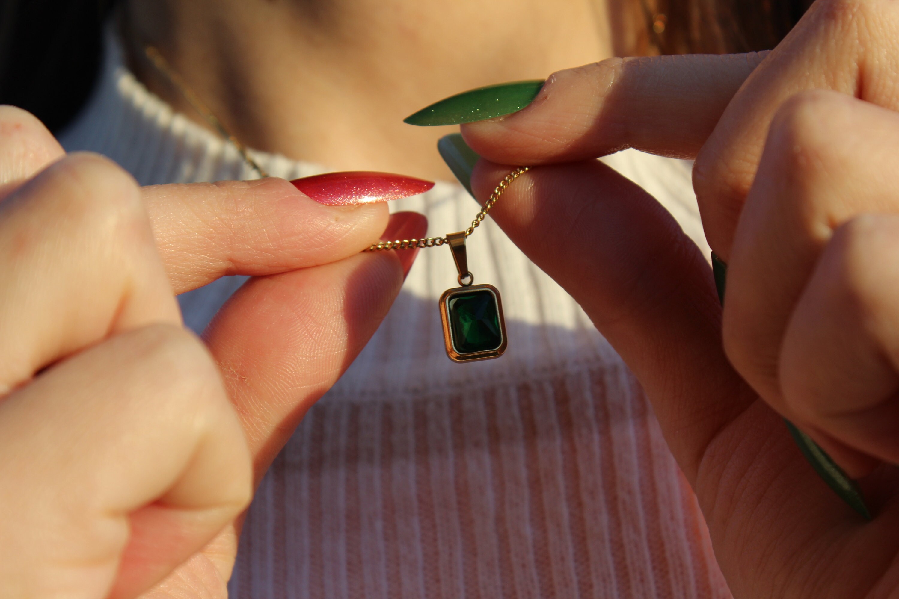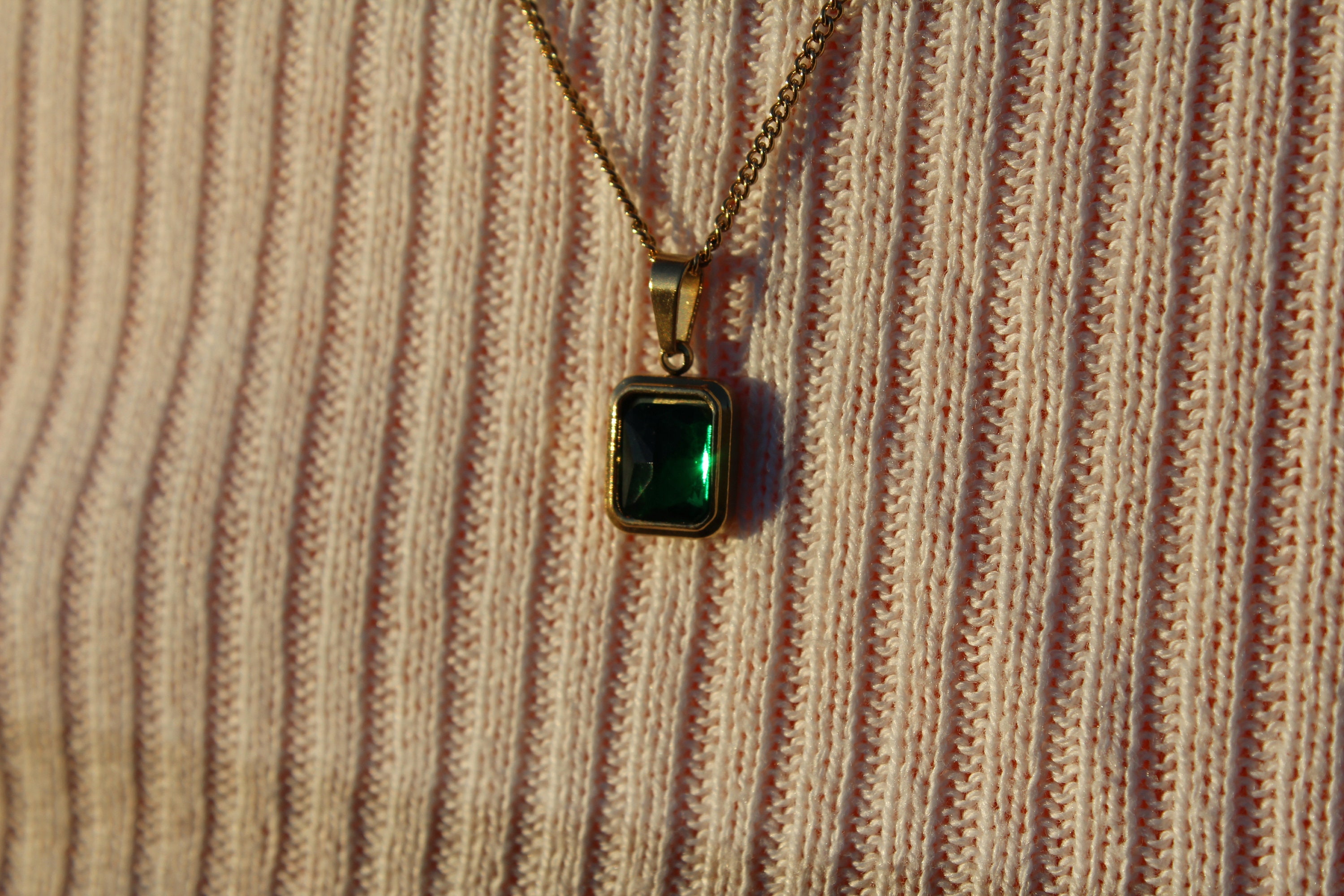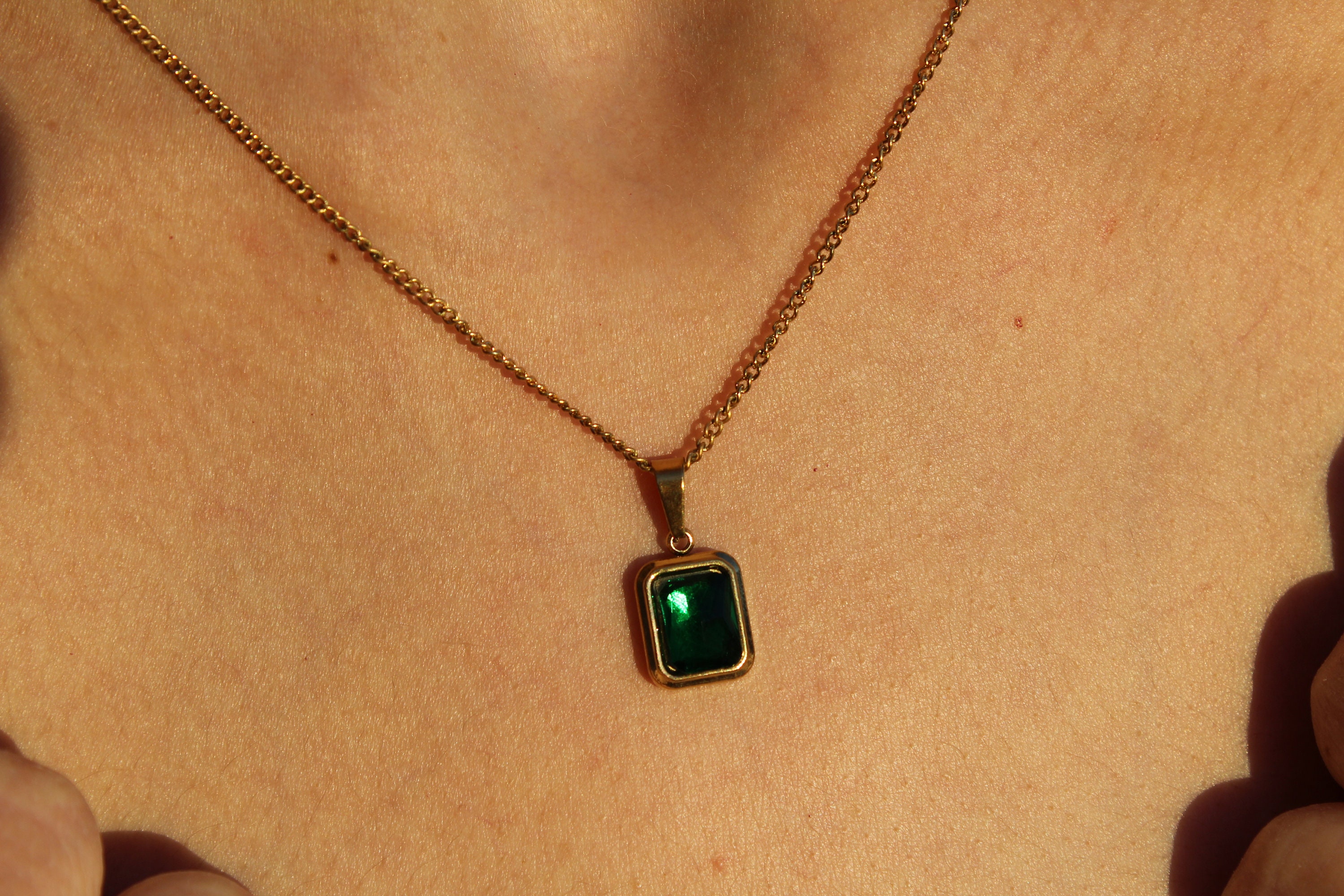 The necklace boasts a square pendant adorned with a captivating green stone, adding a vibrant and natural touch to your style.