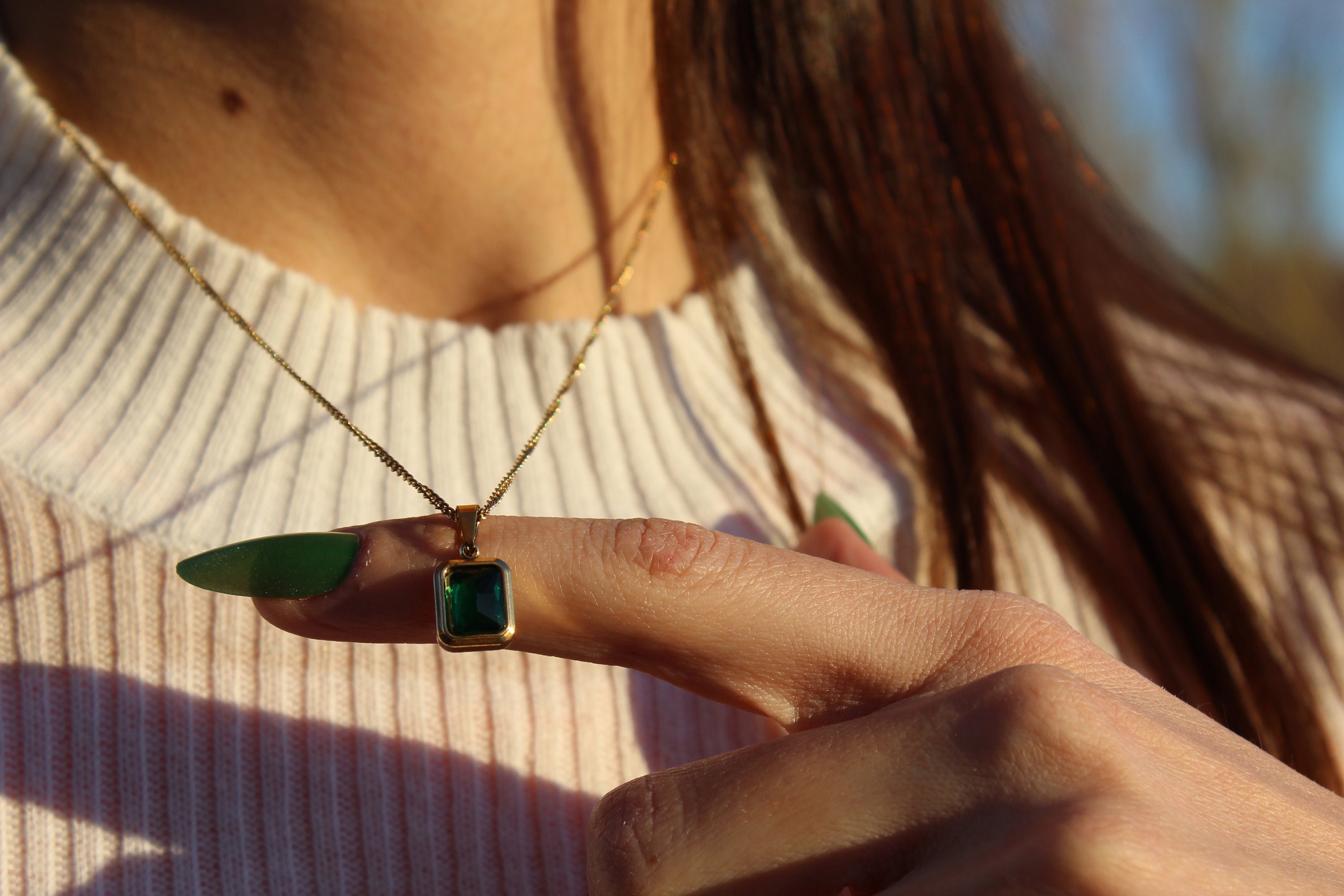 The Green Stone Square Pendant Necklace serves as a thoughtful and stylish gift for her, perfect for birthdays, anniversaries, or any special occasion.