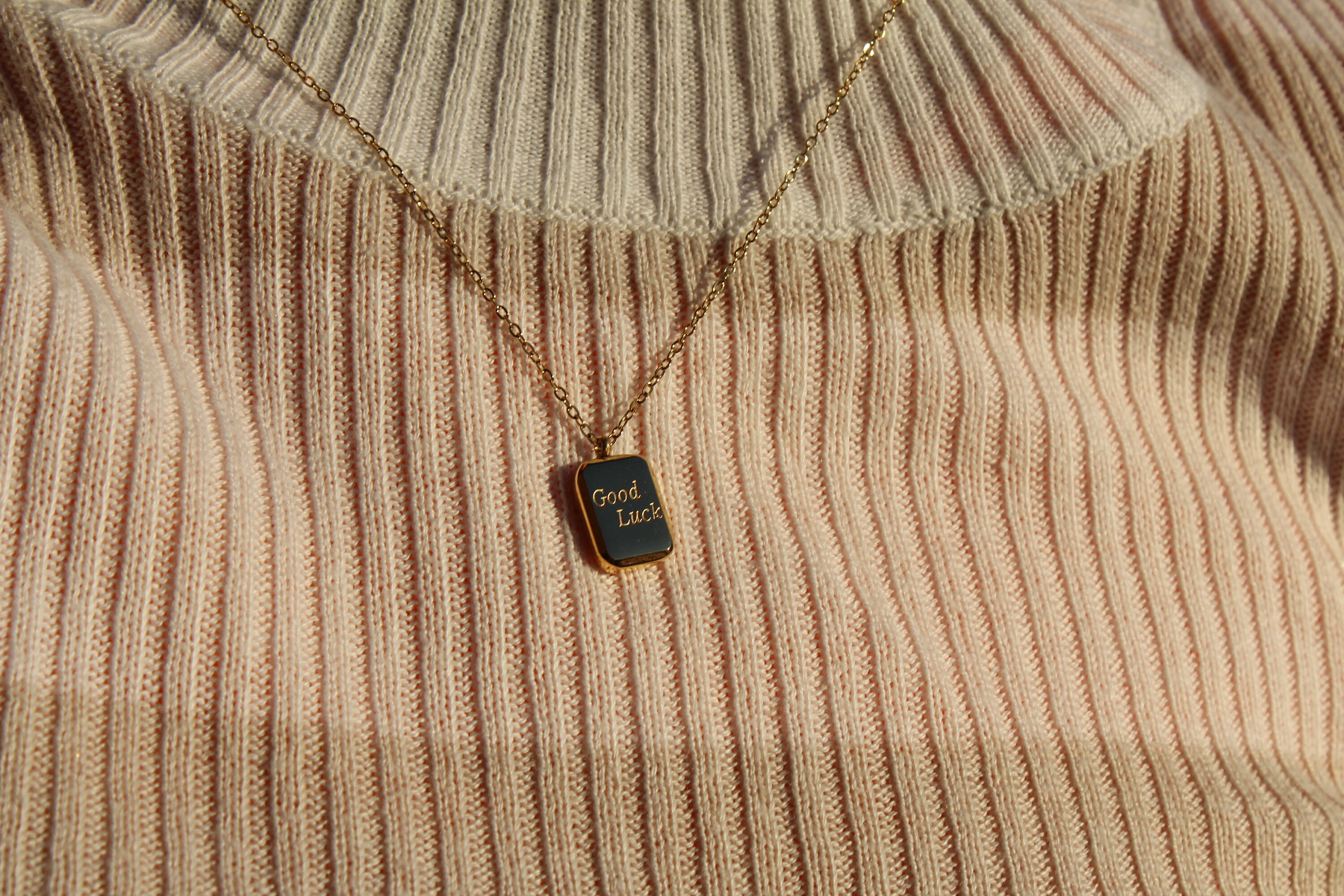 The necklace features a square pendant adorned with a symbol of good luck, adding a meaningful touch to your style.