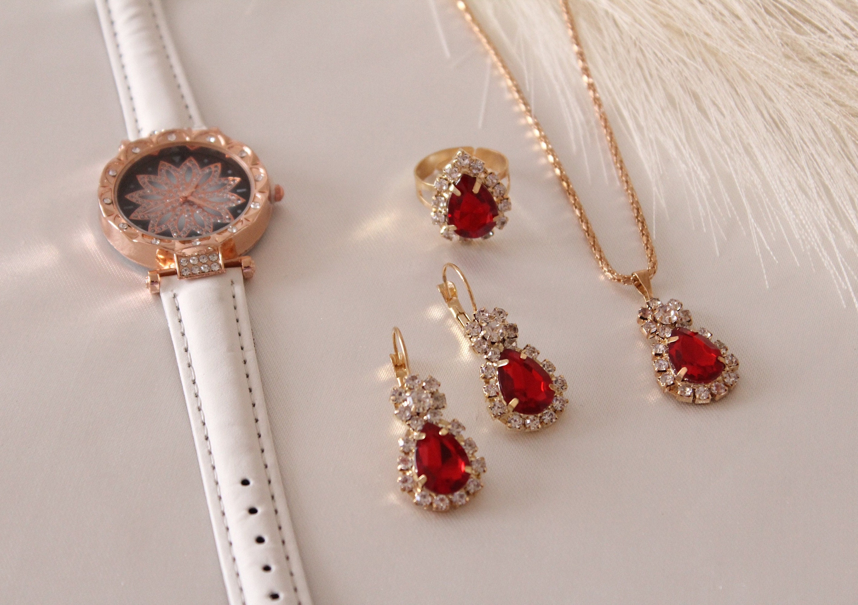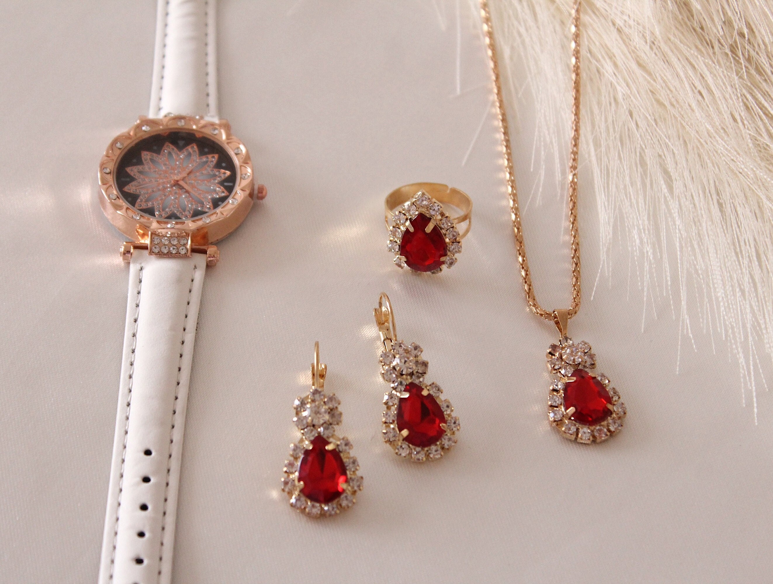 Elevate your fashion with our Luxury 4pcs Jewelry Set. Whether you're attending a special event, a night out, or simply want to add a touch of glamour to your everyday style, this set offers a coordinated and luxurious look. The combination of the leather watch, earrings, resizable ring, and necklace with red diamonds creates a stunning ensemble that showcases your sophistication and individuality.