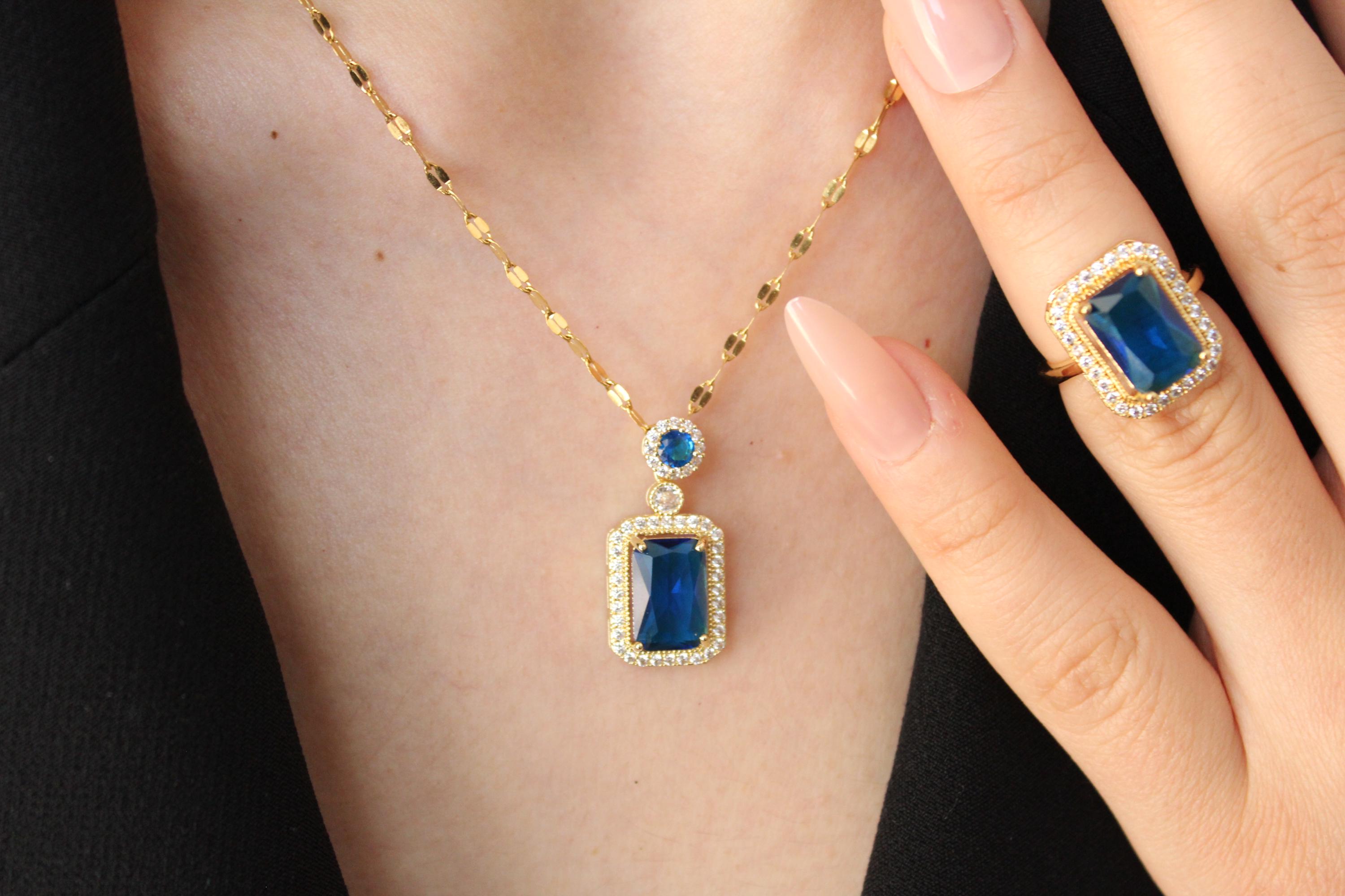 The pendant showcases a magnificent blue zircon as its centerpiece, delicately suspended from a high-quality chain. Its timeless design draws focus to the gemstone, allowing it to shine and make a statement. The accompanying rings, necklace, and earrings echo the same exquisite blue zircon, creating a harmonious and coordinated ensemble that completes your look with grace.
