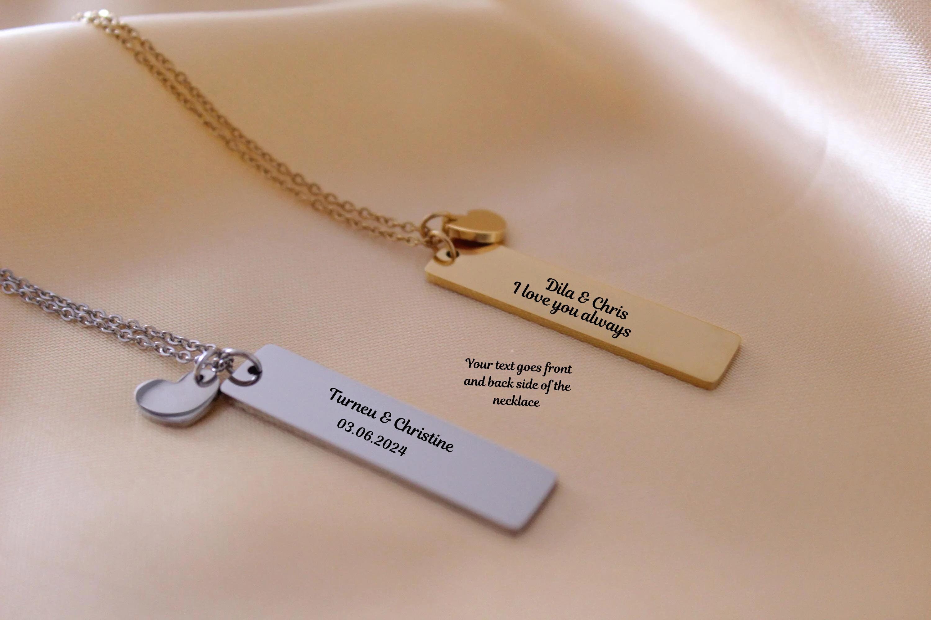 Celebrate the important moments and people in your life with this personalized engraved necklace. Its simple yet sophisticated design makes it the perfect way to keep cherished memories close.