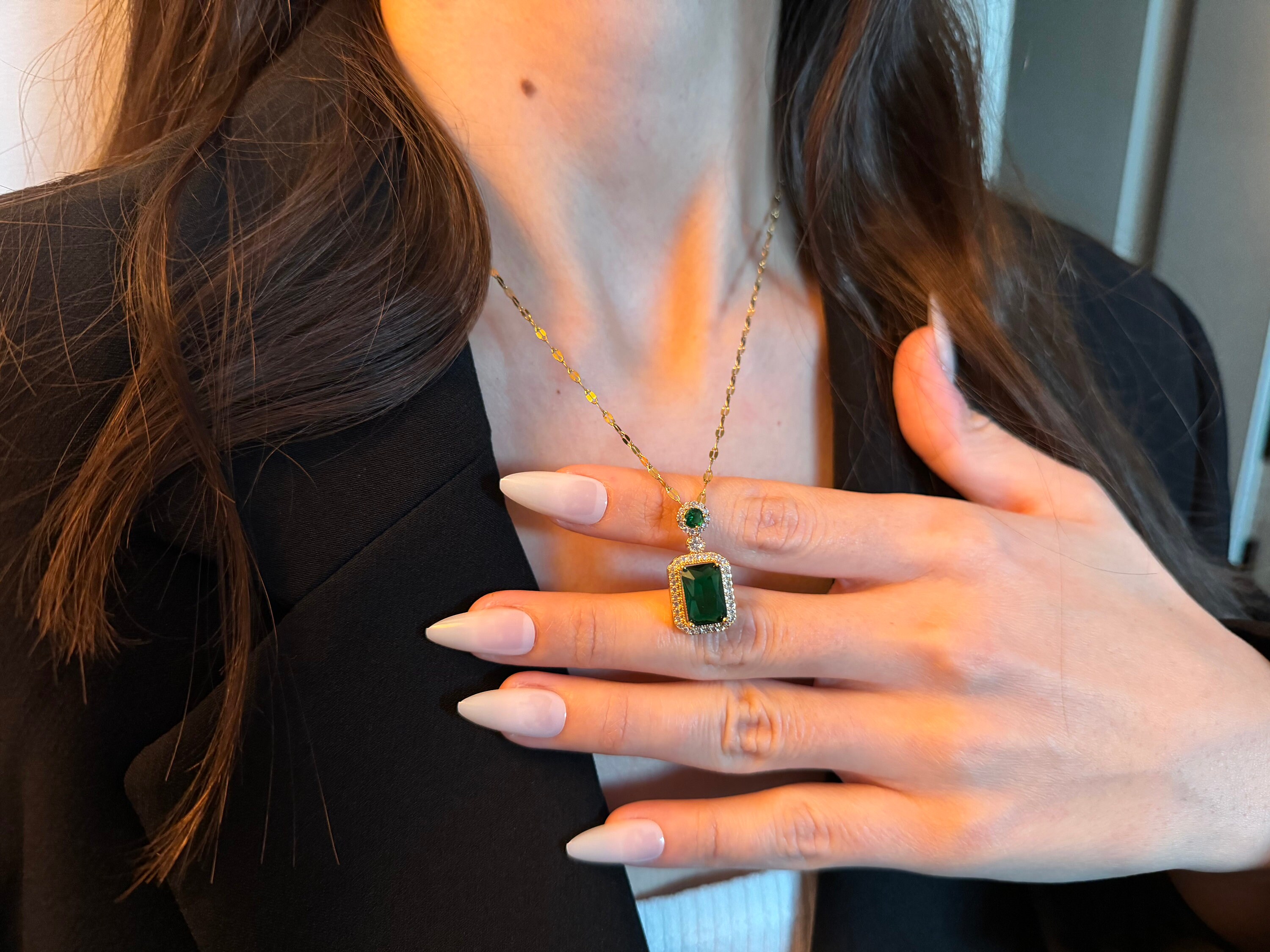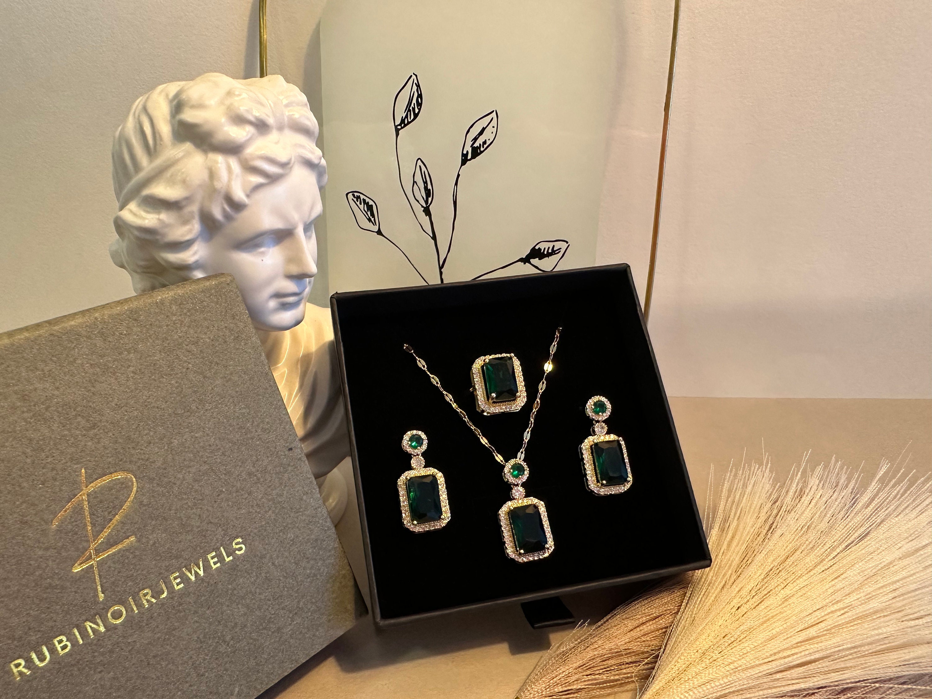 Introducing our exquisite Luxury Green Zircon Jewelry Set, a captivating collection of handcrafted pieces designed to add a touch of elegance and sophistication to your style. This set includes stunning Green Zircon Rings, Necklace, and Earrings, making it the perfect choice for brides, engagements, or any special occasion.